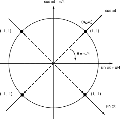 각각의 개념을 일일이 설명할 수는 없기 때문에 위의 여러 방법 중 Phase Shift Keying, 즉 위상을 변경하는 방법에 대해서만 간략하게 살펴보겠습니다. Quadratic Phase Shift Keying은 디지털 데이터를 2bit씩 묶은 뒤, 0을 -1로, 1은 그대로 1로 변환하여 좌표를 만들고, 해당 좌표가 평면에서 차지하는 각을 위상으로 하여 Carrier Signal을 변조하는 방식입니다. 2bit씩 묶으면 표현가능한 값이 4개가 되고, 이 때문에 Quadratic이라는 단어가 앞에 붙었으며 3bit씩 묶으면 8개를 표현할 수도 있습니다.