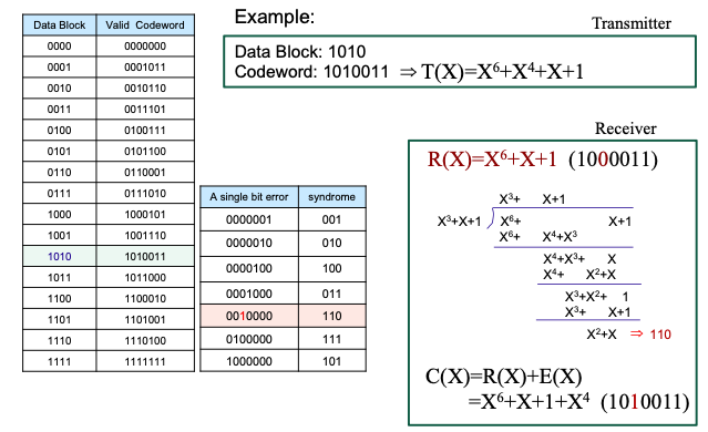 Error Correction은 송신측에서 전송하려는 데이터에 대해 충분한 추가정보(Redundacny)를 제공해서 재전송(Retransmission) 없이 수신 측에서 데이터를 수정하는 방식을 제공합니다. 즉 수신 측에서 데이터를 받았을 때, Error Detection을 통해 이 데이터가 오류가 있음을 발견했더라도, 적절한 Error Correction 방식을 통해 재전송 없이 이 데이터를 수신 측에서 수정해서 상위레이어로 올려 보내는 것입니다. Error Correction의 방법으로는 BCH Code, Hamming Code, Reed-Solomon Code, Convolutional Code, Turbo Code 등 굉장히 여러 가지 방법이 있으나, 마찬가지로 이 포스팅에서 다루려는 범위를 벗어나므로 BCH Code를 통해 Error Correction이 진행되는 예시만 언급하도록 하겠습니다.