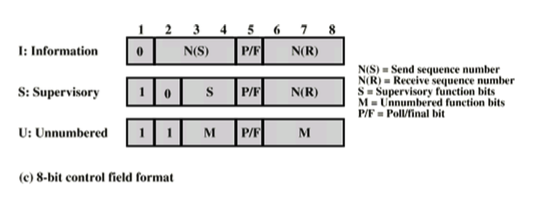 HDLC defines three types of frames, each with a different control field format. Information frames (I-frames) carry the data to be transmitted for the user (the logic above HDLC that is using HDLC). Additionally, flow and error control data, using the ARQ mechanism, are piggybacked on an information frame. Supervisory frames (S-frames) provide the ARQ mechanism when piggy- backing is not used. Unnumbered frames (U-frames) provide supplemental link control functions.