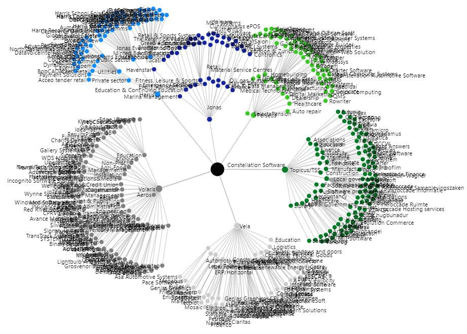 팀원들과 여러 비즈니스 모델들에 대한 이야기를 나누다가 현실 세계에서 Antifragile 한 비즈니스 구조는 과연 어떤 형태일까에 대해 고민하고 있다는 생각을 내비쳤고, 관련된 이야기를 꼬리에 꼬리를 물고 진행하다가 CSI라는 회사를 알게 되었다. 위의 그림에서 보여주듯, CSI라는 회사는 서로 다른 특성들과 도메인을 가진 SaaS 회사를 500개 이상 인수해서 운영되고 있으며 2022년 기준 매출이 $5~8B이고 Market Cap은 $50B 정도 된다고 한다. 이러한 비즈니스 모델로 운영되고 있는 회사 자체를 처음 보기도 했고, 직관적으로 이 회사는 하방압력보다 상방 압력이 큰 비즈니스 구조를 가지고 있다고 생각해서 꽤나 신선한 충격을 받았다. 이 회사를 접하고 거의 일주일 내내 이 모델 (이걸 Constellation Business Model이라 하겠다)에 대한 생각을 지울 수 없었다. 내가 원하는 비즈니스 모델의 형태가 정확히 이러한 것일지에 대해서는 조금 더 고민해 볼 필요가 있겠지만 이러한 형태의 모델이 주는 영감들이 있어 이를 정리해보고자 한다.