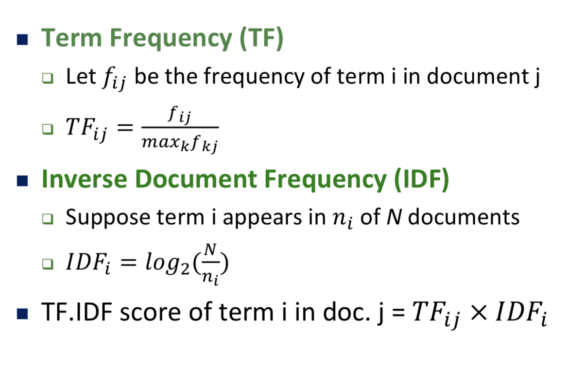 설명을 덧붙이자면, TF는 한 문서에서 특정단어 i가 얼마나 많이 등장하는지를 따지는 것으로, 그 문서에서 찾고 싶은 단어의 개수를 그 문서에서 가장 많이 나온 단어의 개수로 나누어서 0~1 사이의 값으로 나타낸다. 이 TF값이 높을수록 그 문서에서 찾고 싶은 단어의 비중이 많다는 것으로 해석할 수 있다.