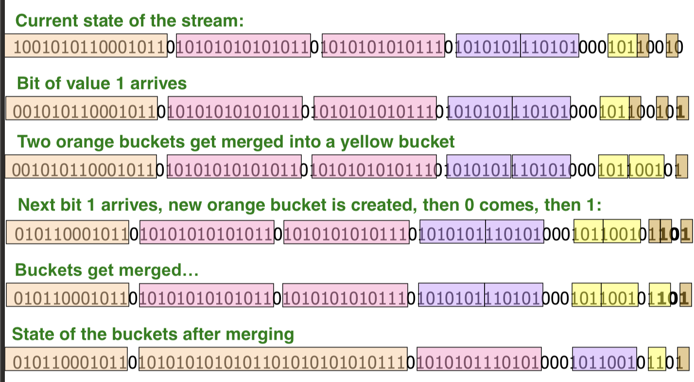 버킷을 업데이트 한다는 것은 스트림에 새로운 원소 (위 문제의 경우 0 또는 1) 이 들어왔다는 것을 의미한다.