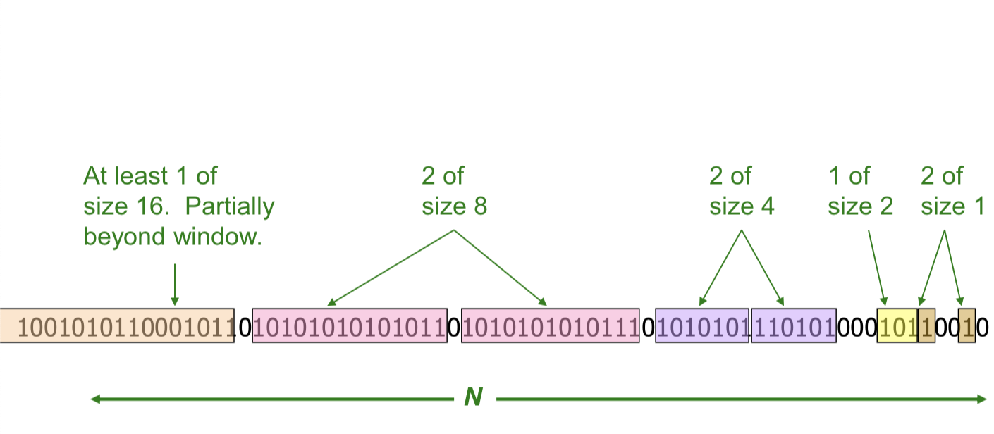 예를 들어, Sliding Window를 구성하는 데이터의 개수가 2^100인 경우 1000^10의 공간이 아닌, 10,000의 상수배의 메모리만을 차지하는 셈이니 굉장히 메모리를 절약할 수 있게 된다. 에러는 최대 50%로 작은 편은 아니다 (왜 최대 50%인지는 뒤에서 설명하겠다.)