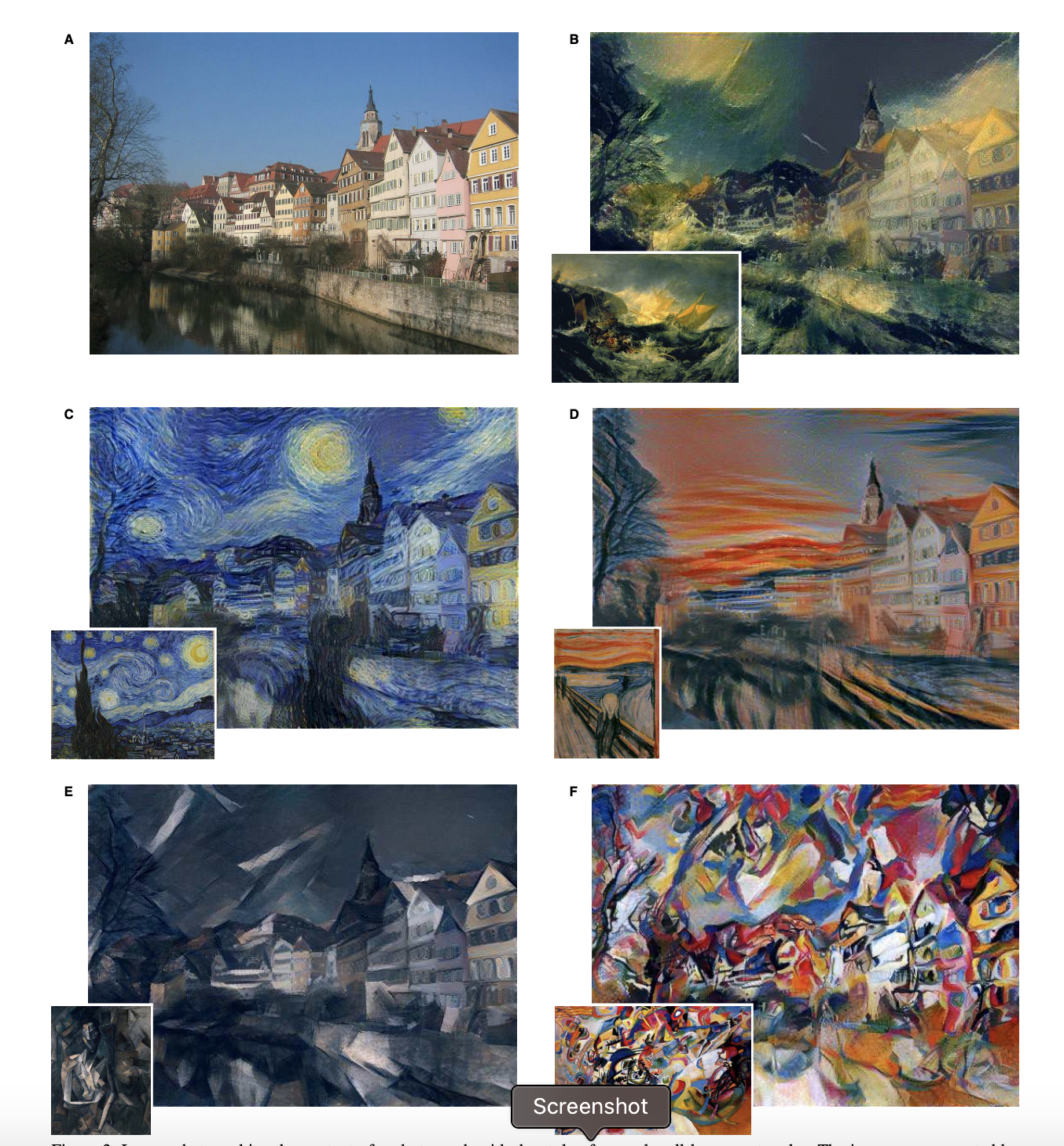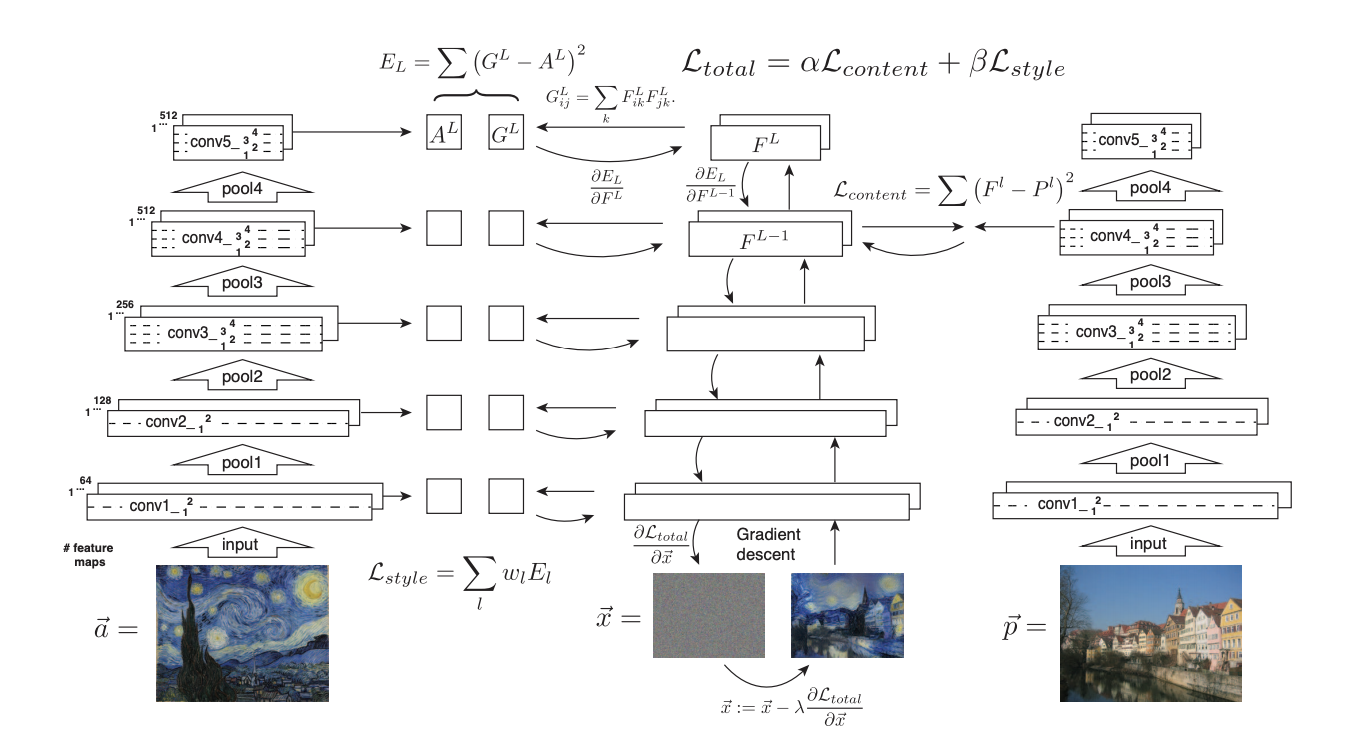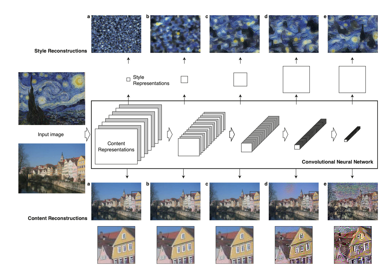 위 사진에서 확인할 수 있는 것처럼 하나의 이미지(호숫가와 집이 있는 그림)에서 Content를 추출하고 또 다른 하나의 이미지 (고흐의 'Starry night')에서 Style을 추출하여 두 특성을 합성한 새로운 이미지를 생성해 내는 방법을 제시하는 것이 이 논문의 주된 내용이라고 할 수 있습니다.