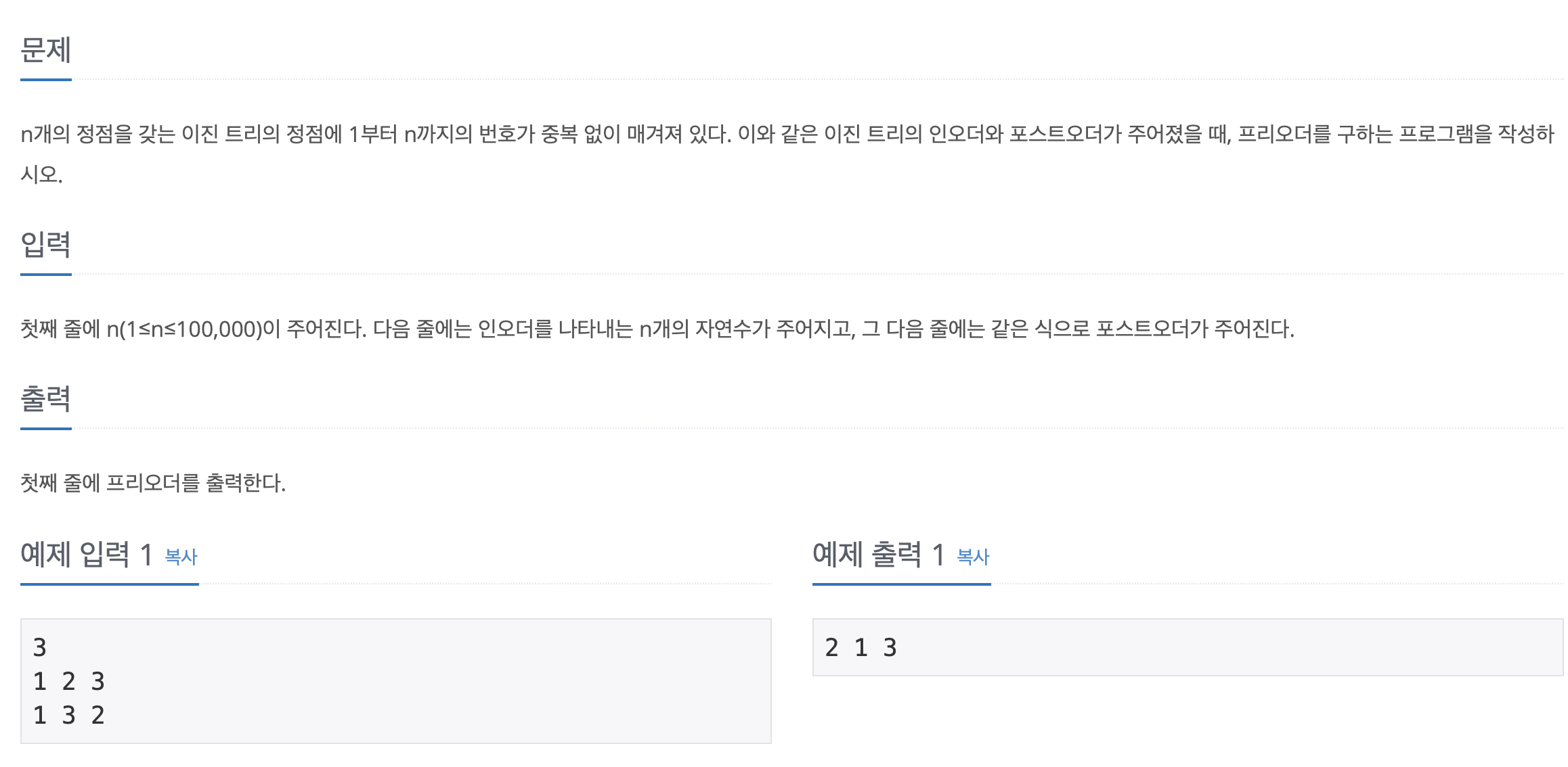 트리의 중위 순회(InOrder), 후위 순회(postOrder)의 성질을 이용하여 전위 순회(preOrder)의 결과를 출력하라는 문제입니다. 중위 순회와 후위 순회를 이용해서 직접 트리를 생성한 후에 그냥 전위 순회를 재귀적으로 호출하는 방법도 있겠지만, 이 방법은 트리를 생성해야 하기 때문에 귀찮고 비효율적인 작업이 될 가능성이 보여서 다른 방법으로 문제를 해결하였습니다.