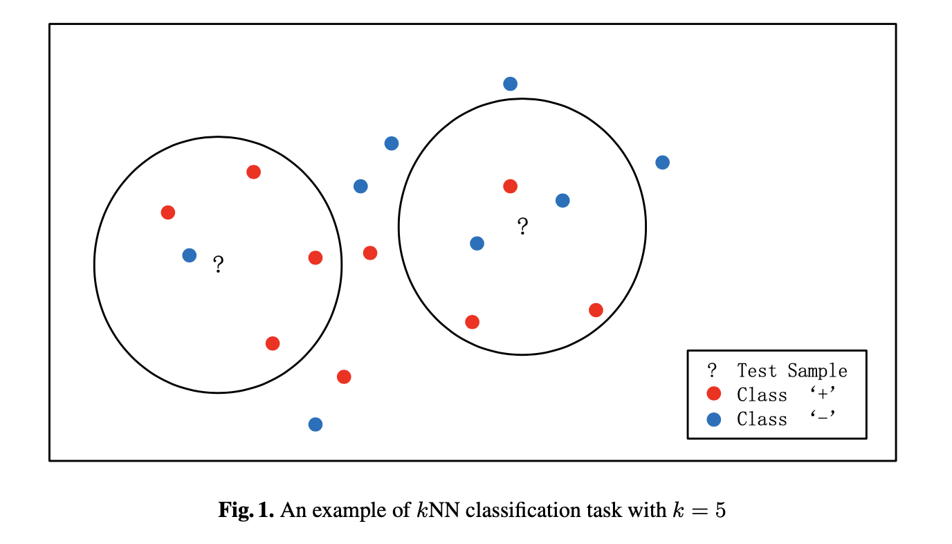 앞서 Abstract에서 언급했듯, KNN알고리즘의 핵심 원리는 서로 가까이 있는 샘플들일 수록 같은 클래스로 분류될 가능성이 높다는 것입니다. 분류해야 하는 샘플과 K번째까지 가까운 이웃들을 골라서 그중에 다수표를 차지하는 클래스의 레이블로 분류하는 이 방식은, 명시적인 훈련 과정이 없는 알고리즘으로 잘 알려져 있습니다. 그저 테스트 샘플을 분류할때 저장된 기존의 데이터들과 거리를 계산해주기만 하면 되기 때문입니다. (자세히 : KNN 시간복잡도)