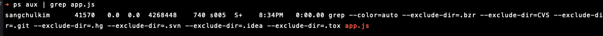 해당 컨테이너에서 나와서 로컬머신(호스트)에서 다시 한번 ps aux를 통해 실행되고 있는 전체 프로세스들의 목록 중 app.js가 돌고 있는지를 한번 확인해보면 1번이 아닌 41570번 프로세스로 돌고 있는 것을 확인할 수 있습니다. 즉 실제로는 Host OS에서 돌고 있는 프로세스이지만 linux namespace를 통해 격리된 환경에서 실행되고 있는 것입니다.