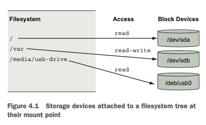 컨테이너는 고유의 파일 트리를 가지고 있으며 마운트 네임스페이스(MNT namespace)를 갖기 때문에 리눅스 파일 시스템 하에서 위에서 설명한 일종의 "저장장치"처럼 기능할 수 있습니다. 각각의 저장장치는 호스트의 파일 트리의 특정한 위치 (e.g /var)에 마운트 될 수 있으며, 반대로 저장장치 안의 파일 트리의 특정한 위치에 마운트 할 수도 있습니다. 실제로 도커 컨테이너는 이런 방식으로 파일 시스템을 관리하게 됩니다.