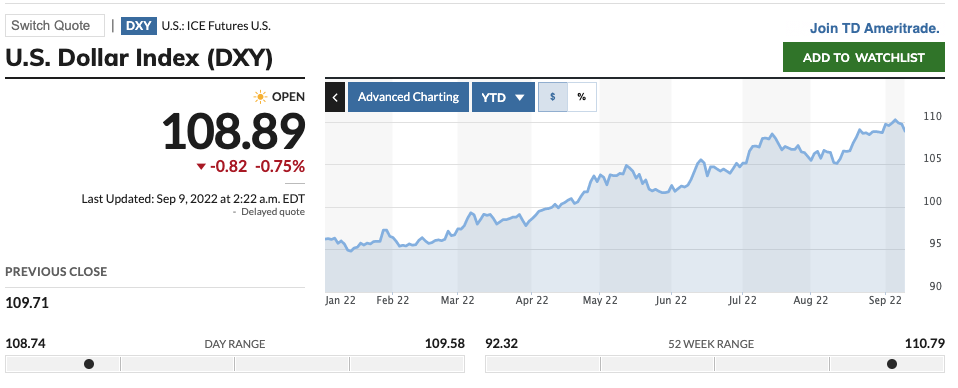 심상치 않은 달러 강세가 지속되면서 달러 인덱스가 110에 근접했다. 원-달러 환율은 1380에 가깝고, 엔-달러 환율은 140을 훌쩍 넘긴 지 오래다. 하지만 여러 상황들로 미루어봤을 때, 달러 강세는 당분간 계속 지속될 것으로 보인다. 제롬 파월 연준 의장은 8월 잭슨 홀 연설에서 가계와 시장에 어느 정도의 고통(Pain)을 가져다주더라도 연준은 인플레이션이 2% 수준으로 내려오기 전까지는 긴축적인 태도를 멈추지 않을 것이며, 9월 8일 워싱턴 연설에서 이 생각이 변하지 않았음을 다시 한번 언급했다. 이에 따라 목요일 연설 직후 시장은 9월 FOMC 회의에서 연준이 금리를 75bp 인상할 가능성을 90% 이상으로 전망했고 이는 연준이 연달아 3차례의 자이언트 스텝(Giant Step)을 밟게 되는 것이다.