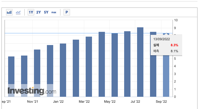 9/13일 발표된 8월 CPI가 예상치인 8.1%를 상회한 8.3%를 기록하면서 글로벌 거시 경제에서 인플레이션이 쉽사리 주저앉지 않을 것으로 보인다. 게다가 CPI에서 에너지 가격 등의 수치를 제외한 근원 CPI(연준이 헤드라인 CPI보다 중요하게 여기는 것)는 오히려 지난달 5.9%를 상회한 6.3%를 기록했다. 이는 현재 전 세계적인 에너지 공급 문제를 제외하고 보더라도 월세, 임금과 같은 보다 근원적인 영역에서 인플레이션이 꺾이지 않고 있다는 것을 의미하며 월세, 임금과 같은 요인들은 한번 올라가면 쉽게 내려오지 않는 하방경직성이 강한 요인들이기에 더 우려스럽다.