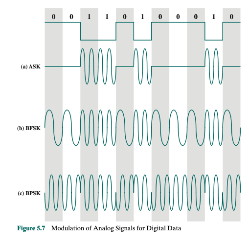 디지털 데이터를 전화선과 같은 매체를 통해 전달하기 위해서는 Analog Signal로 변환해야 합니다. Analog Signal은 연속적인 주파수의 형태를 띠기 때문에 Digital Signal과는 다르게 데이터를 Sinusoidal Carrier Signal에 실어서 전송하게 됩니다. 이는 Sinusoidal Carrier Signal이 변형되는 것을 의미하며, 어떤 부분이 변형되느냐에 따라 ASK(Amplitude, 진폭), FSK(Frequency, 주파수), PSK(Phase, 위상)으로 나누어지게 됩니다. 아래는 "00110100010"이라는 디지털 데이터가 Sinusoidal Carrier Signal에 실려 변형된 모습입니다.